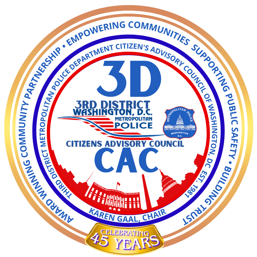 ๐๏ธ Attend the District Wide 3D CAC Monthly Community Meeting: Last Thursday of each month, 7:00 PM, 3rd District MPD Station, 1620 V Street, NW ๐ง Email Concerns: 3DCACDC@gmail.com ๐ Online Newsletter: 3DCACDC@gmail.com๐ฑ Emergency Issues: Call MPD directly, then notify CAC for follow-up 202-854-1620